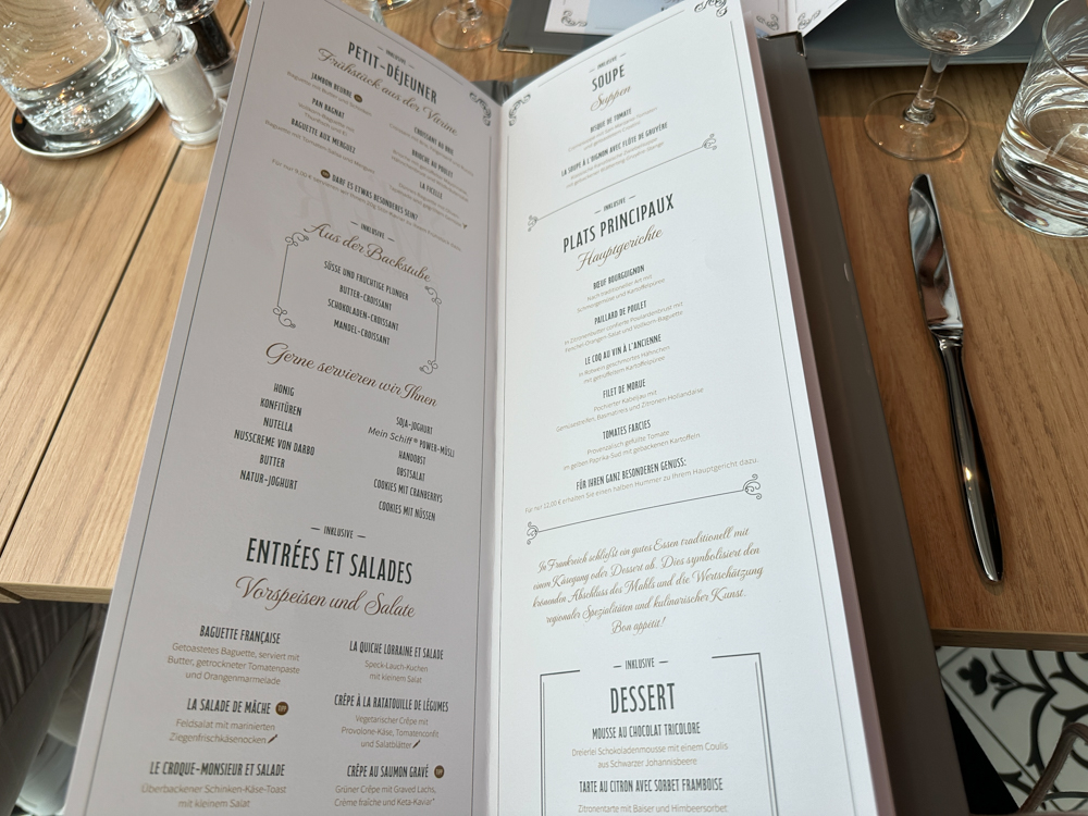 Door de Premium All-Inclusive Service heb je een cruise met weinig extra uitgaven. Drankjes die zijn inbegrepen, staan duidelijk in het bar menu. Denk aan niet-alcoholische én alcoholische drankjes, zoals bier, (basis) cocktails, koffiespecialiteiten en een selectie wijnen. Eigenlijk blijft er vrij weinig over waarvoor je moet betalen: er zijn enkele exclusieve restaurants waarover ik je zo meer vertel. Aan de hand van de eetmomenten op een dag, neem ik je mee naar de restaurants van Mein Schiff Relax.