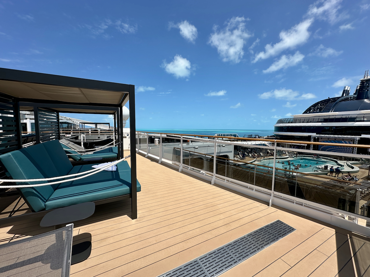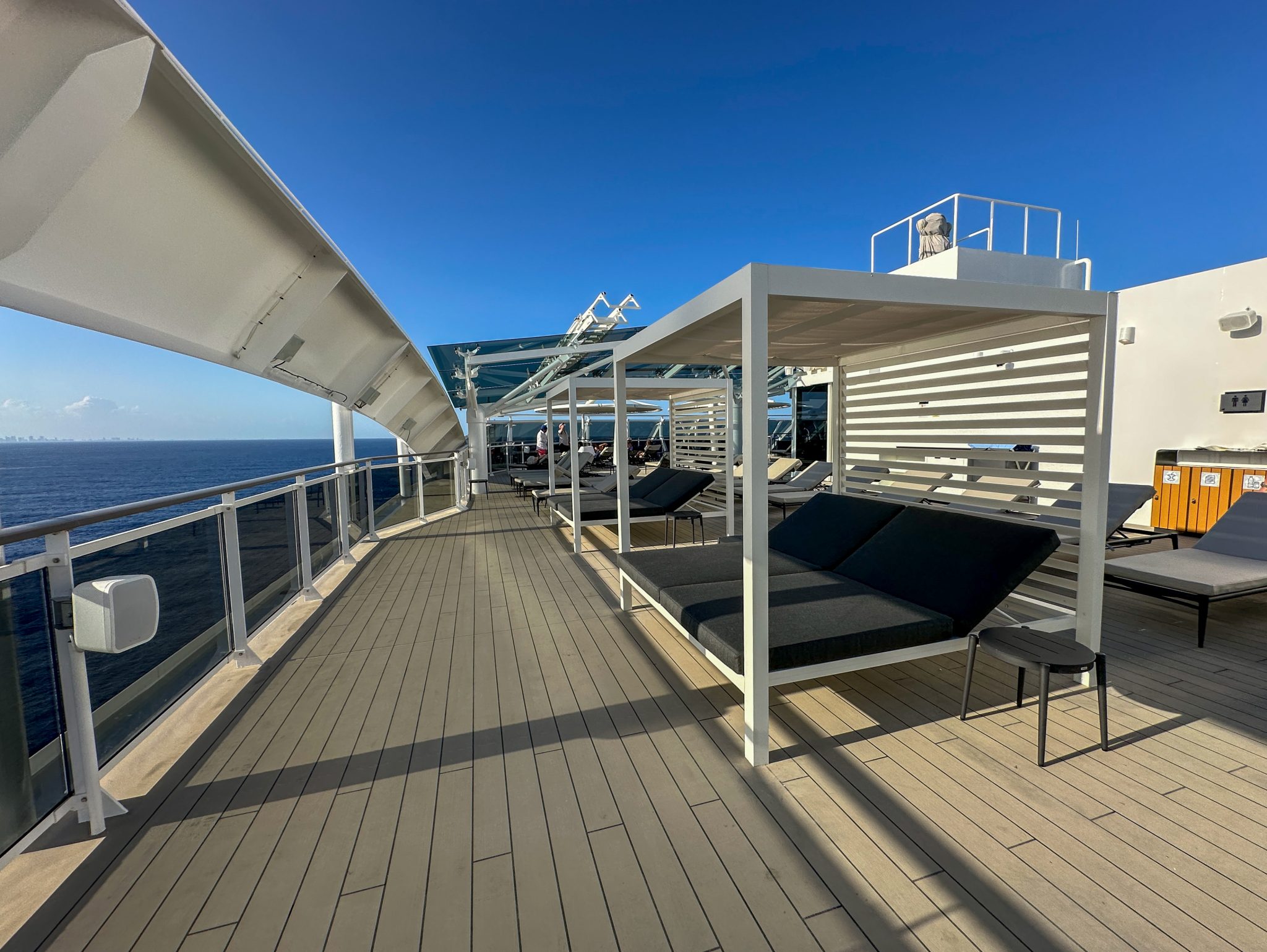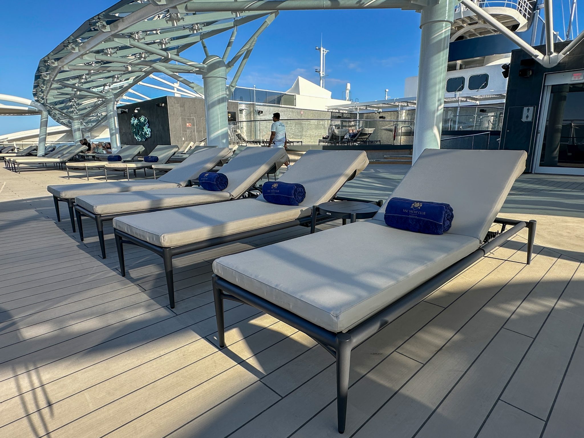 Het luxe schip-in-een-schip-concept heeft prachtige ruimtes, waarbij mij vooral de zeer ruime lichte lounge met een buitenterras weer opvalt. De Swarovski trap leidt je vanaf de lounge (dek 19) naar het eigen restaurant (dek 20) waar je elk moment kunt binnenstappen voor ontbijt, lunch en diner. Ga je vervolgens weer een dek hoger dan kom je op de twee boven elkaar gelegen zonnedekken met een grill & bar op dek 21 en tal van zonnebedden op dek 22. Het blijft opvallend fijn dat de MSC Yacht Club kiest voor royale zonnebedden met matrassen erop. De cabana’s zijn wat stijlvoller dan op de MSC World Europa, met donkere kleuren. Ook de lounge is wat stijlvoller geworden.