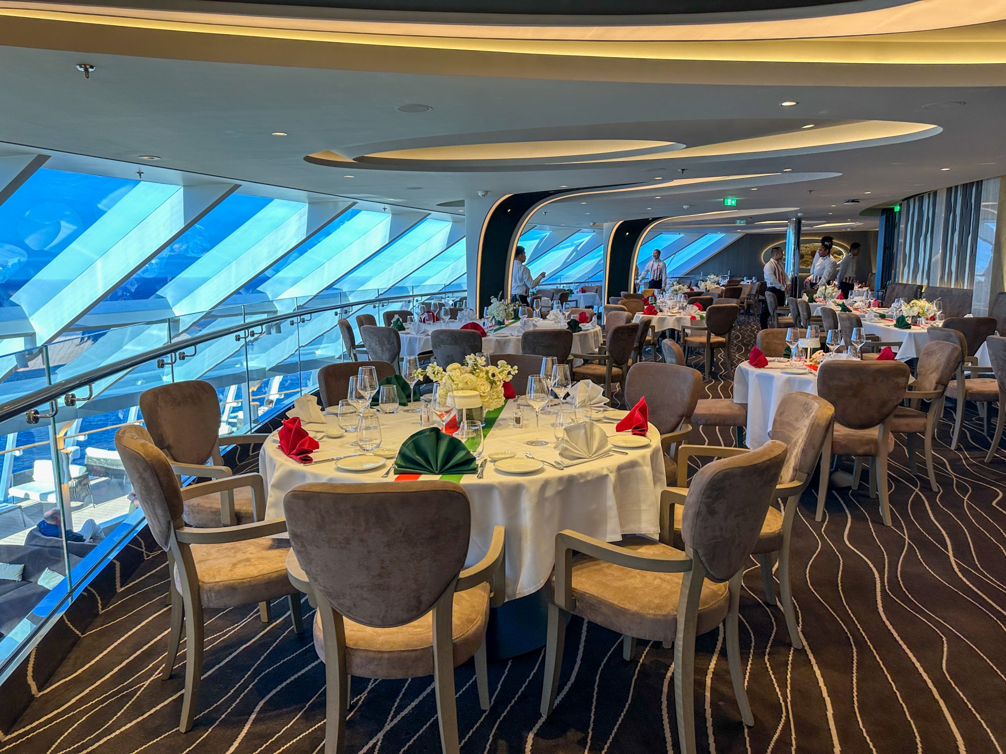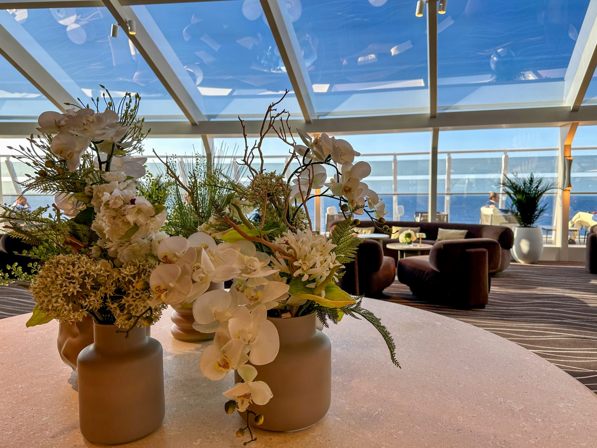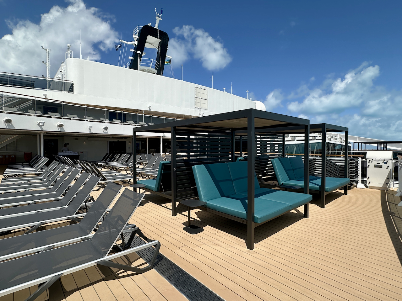 Het luxe schip-in-een-schip-concept heeft prachtige ruimtes, waarbij mij vooral de zeer ruime lichte lounge met een buitenterras weer opvalt. De Swarovski trap leidt je vanaf de lounge (dek 19) naar het eigen restaurant (dek 20) waar je elk moment kunt binnenstappen voor ontbijt, lunch en diner. Ga je vervolgens weer een dek hoger dan kom je op de twee boven elkaar gelegen zonnedekken met een grill & bar op dek 21 en tal van zonnebedden op dek 22. Het blijft opvallend fijn dat de MSC Yacht Club kiest voor royale zonnebedden met matrassen erop. De cabana’s zijn wat stijlvoller dan op de MSC World Europa, met donkere kleuren. Ook de lounge is wat stijlvoller geworden.