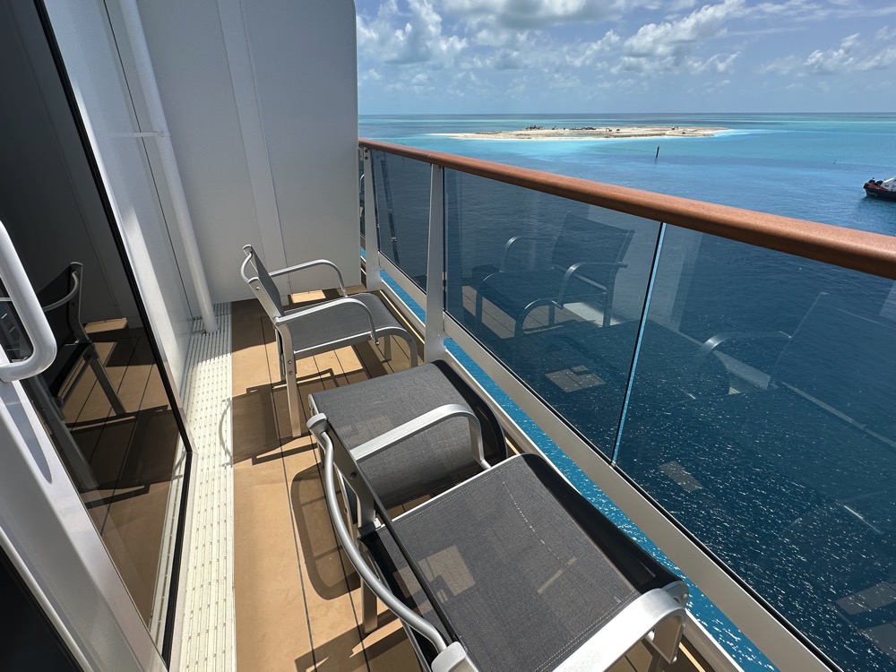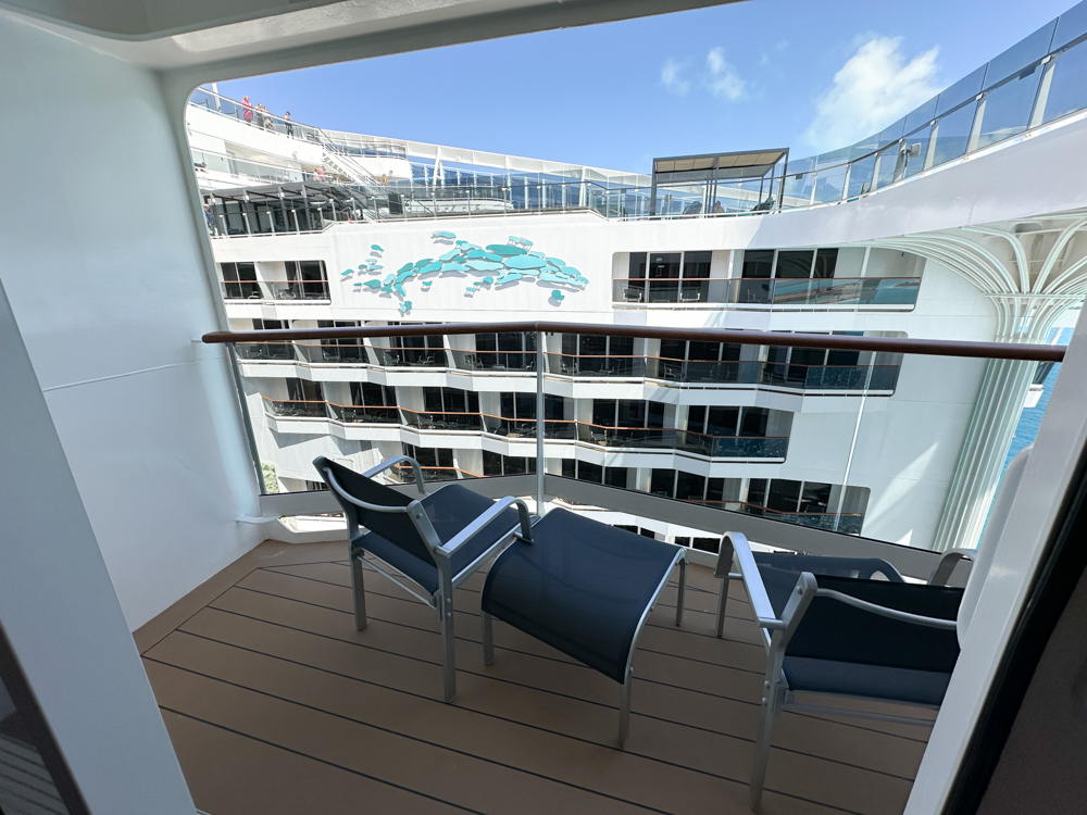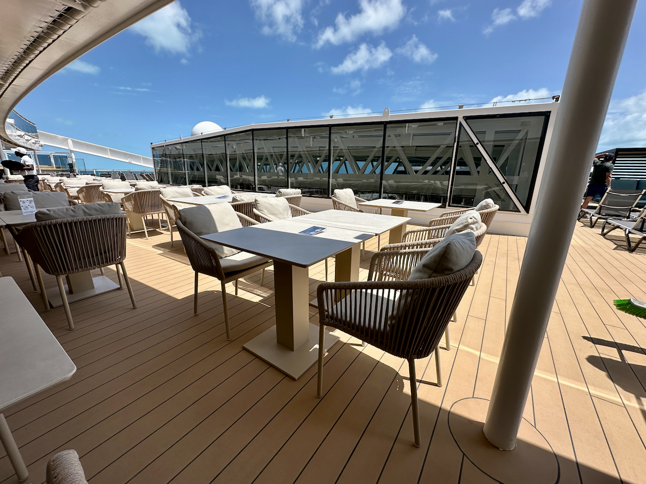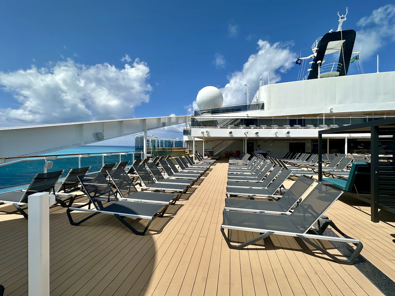 Ik wil je wel een tip meegeven als je een zonaanbidder bent: vermijd zeker de bovenste 2 dekken die in een inham gelegen zijn, midscheeps. De schaduw van het overhangende dek daarboven, hangt volledig over deze balkons. Je hebt vrijwel geen zon.