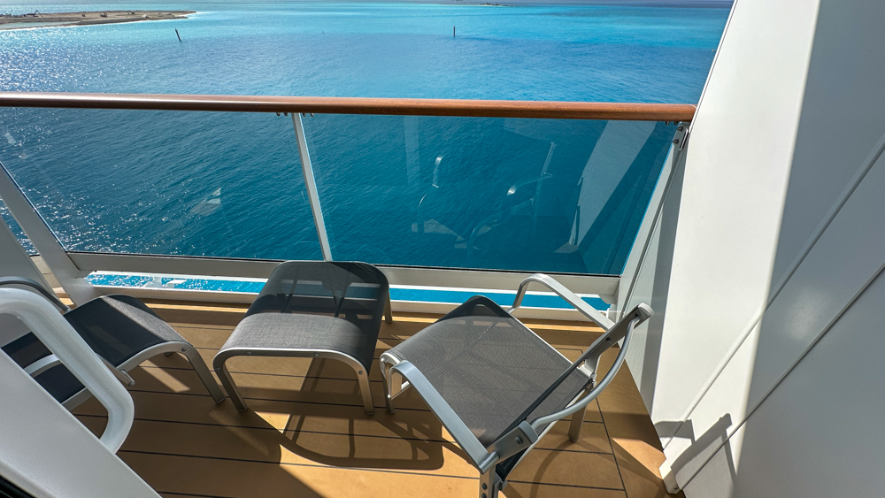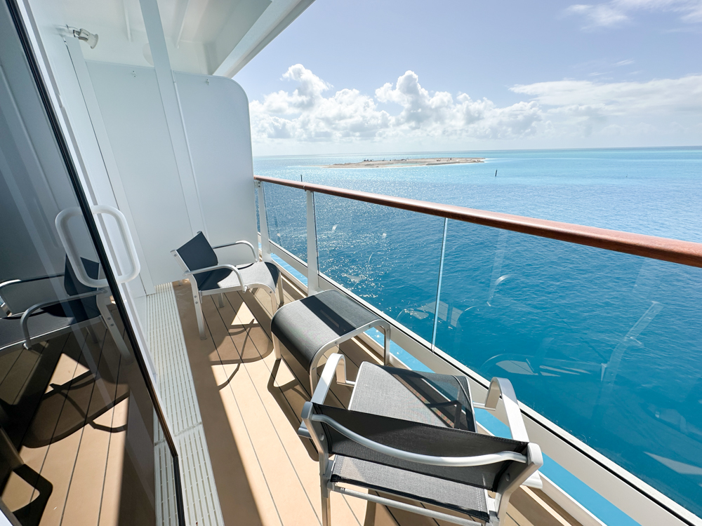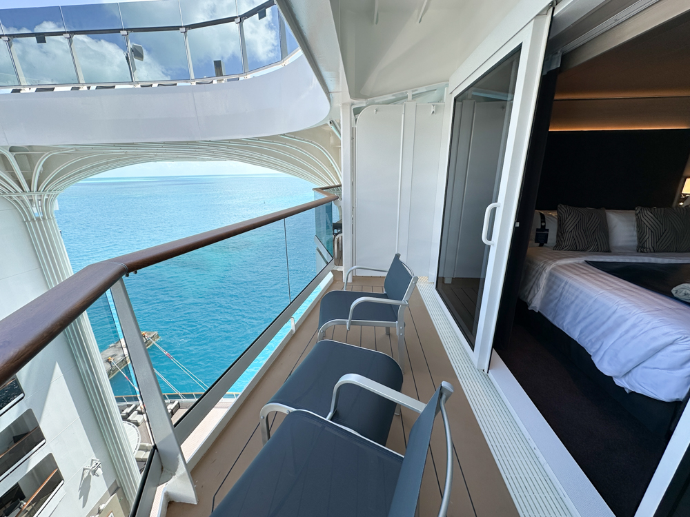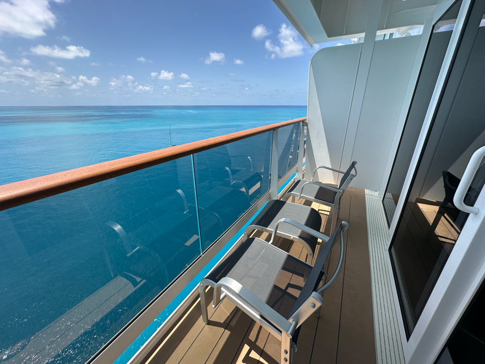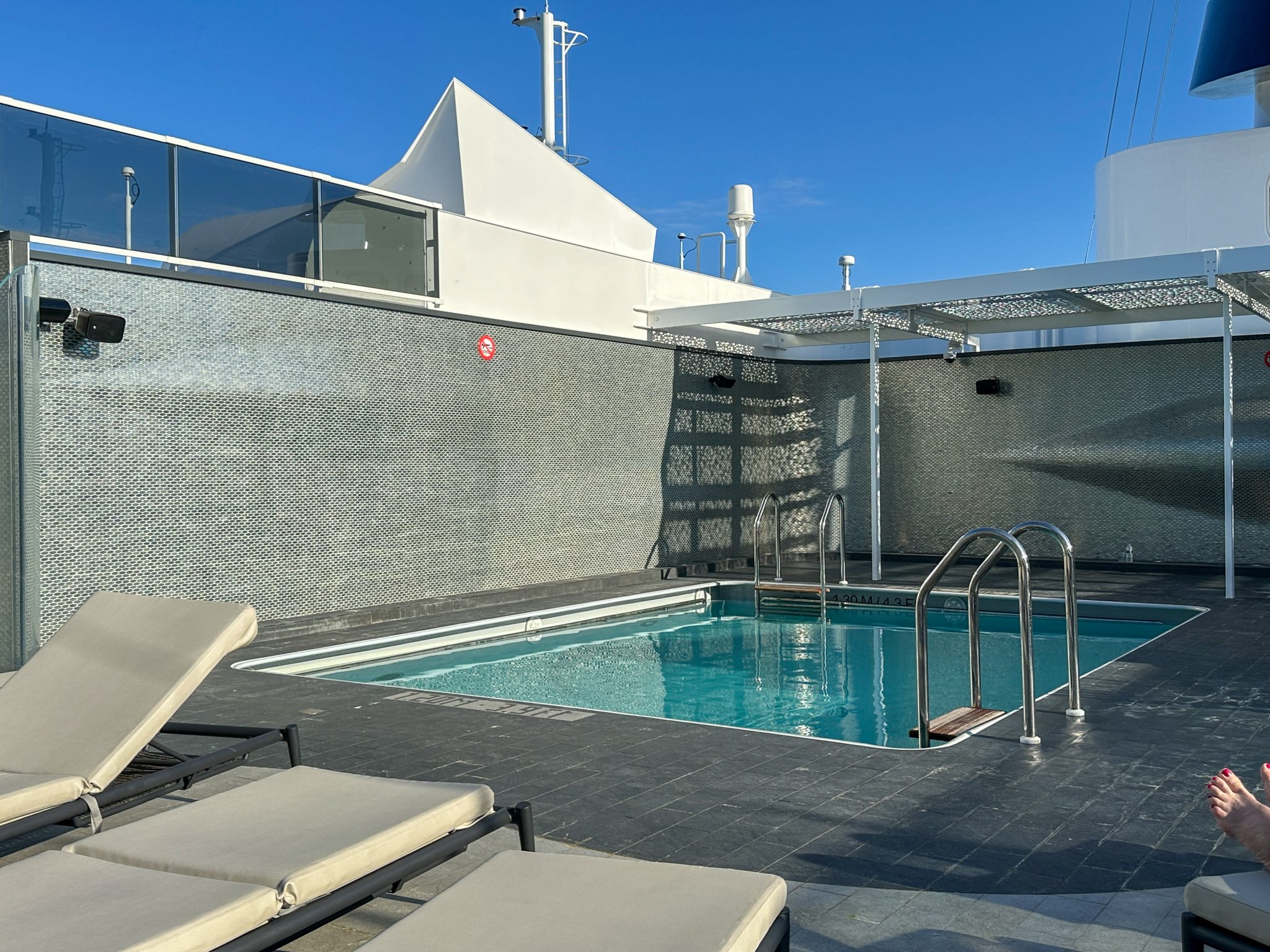 Ik wil je wel een tip meegeven als je een zonaanbidder bent: vermijd zeker de bovenste 2 dekken die in een inham gelegen zijn, midscheeps. De schaduw van het overhangende dek daarboven, hangt volledig over deze balkons. Je hebt vrijwel geen zon.