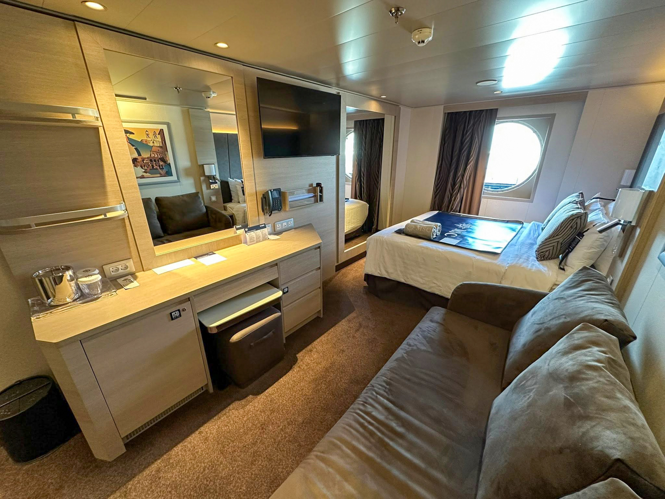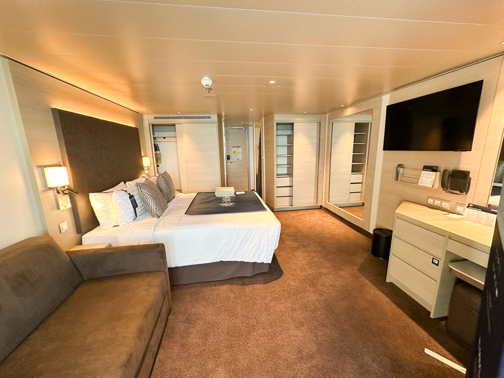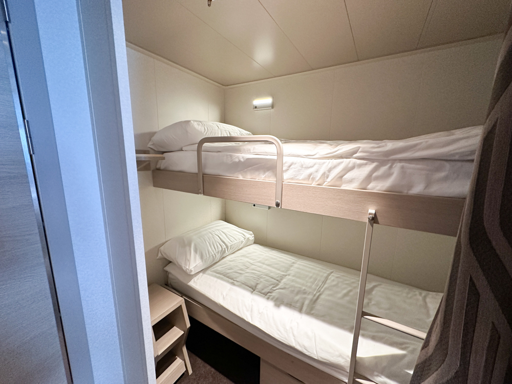 De reguliere binnenhut is 15 vierkante meter en biedt plek tot 4 personen. Deze binnenhut voelt behoorlijk ruim aan. Er is een krukje om te zitten en een soort van tafeltje, beide onder het bureau. Daarnaast is er een extra stoel. Standaardinrichting van de binnenhut bestaat ook weer uit een bureau met tal van stopcontacten (2 Europees), usb poorten bij de nachtlampjes, een minibar tegen betaling en een kluisje in de kledingkast. Je ziet hieronder foto’s van nr. 14109.