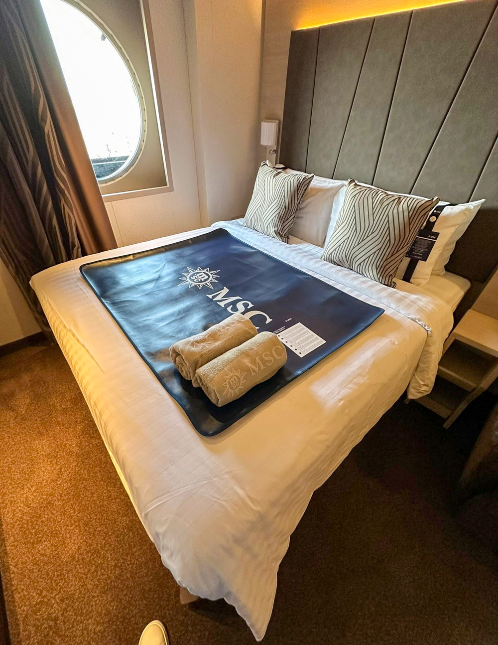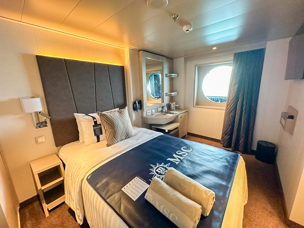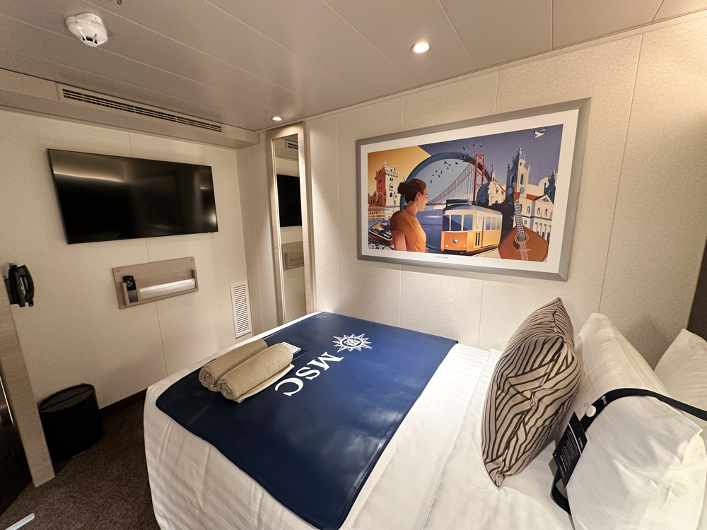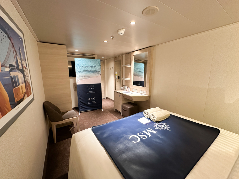 Bij MSC Cruises vind ik het aardig om altijd even naar de kleurstelling van de hutten te kijken. De kleurstelling van alle kamers op het schip blijft wat donker net zoals op de Euribia en de World Europa: de kleur van het bureau is lichter op de World klasse schepen, maar de trendkleur bruin vind je overal terug. De gordijnen en sierkussens zijn voorzien van een soort zebra motief, die je ook in de gangen terugvindt.