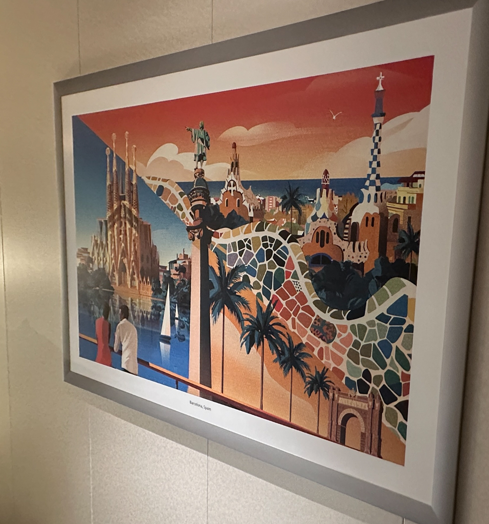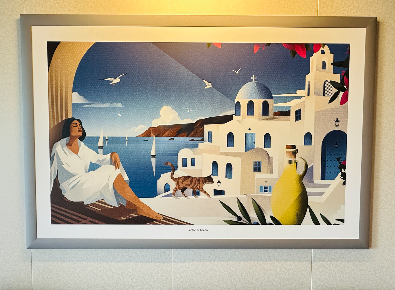 De kunst in de hutten is op de MSC World America is wel wat kleurrijker dan op de andere schepen: je ziet afbeeldingen van Europese populaire bestemmingen zoals Santorini, Parijs, Barcelona, Amsterdam, Kopenhagen, Londen en Lissabon.