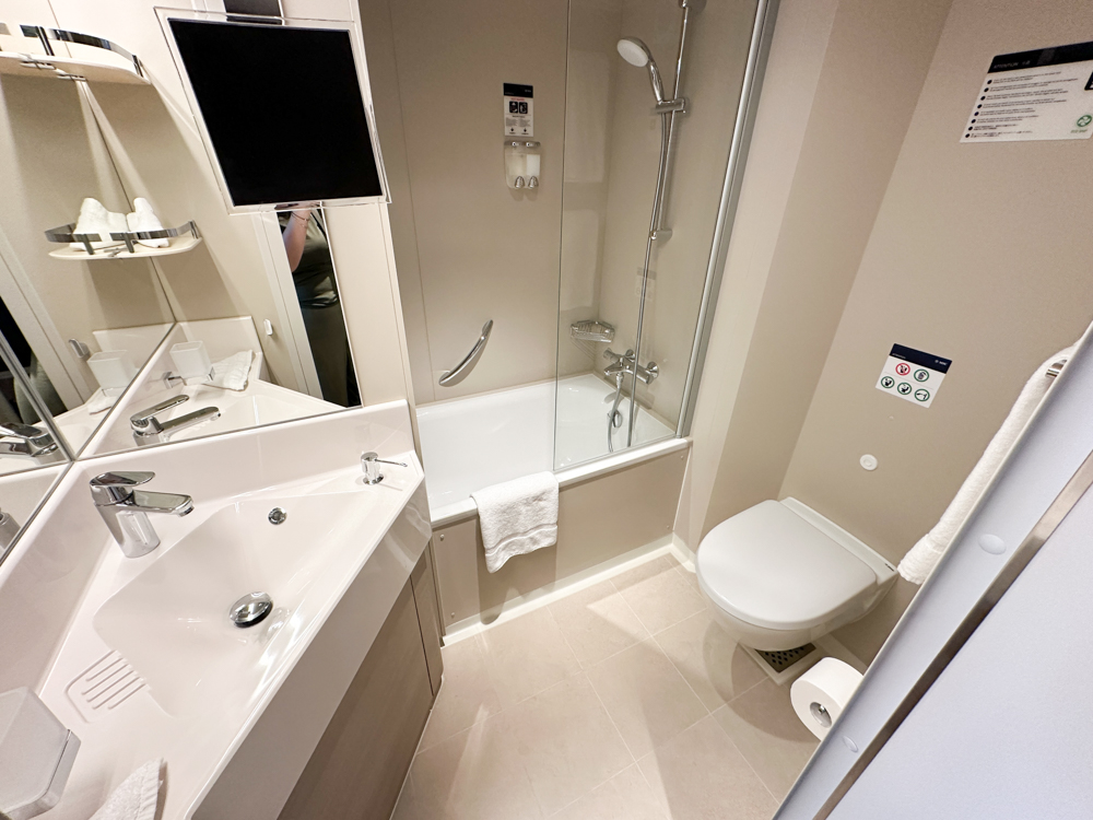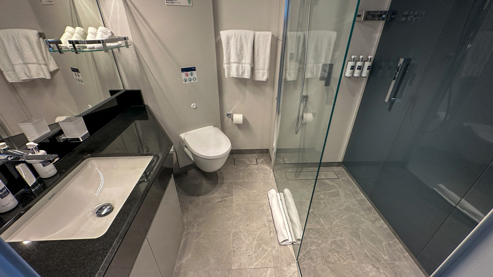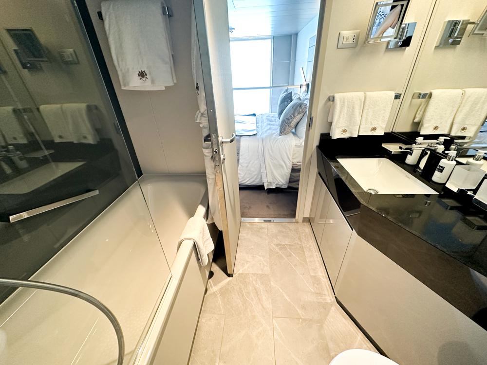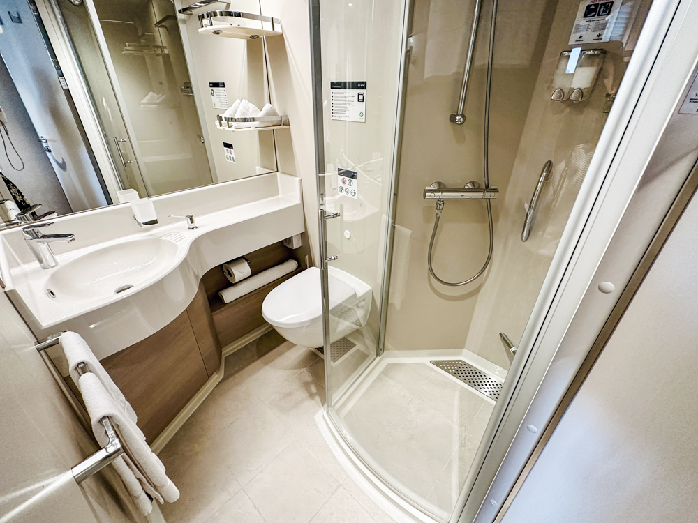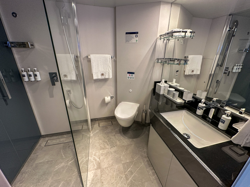 De badkamer is ruim en voorzien van badproducten van MSC zelf, ipv Bulgari.