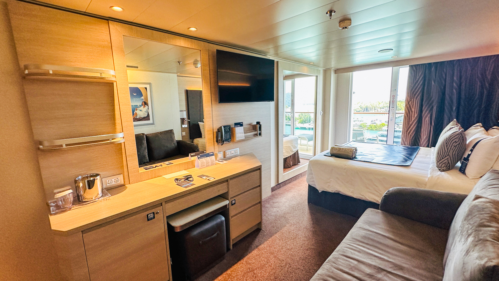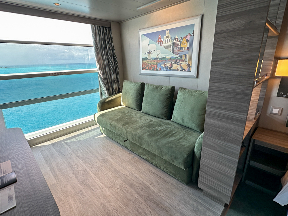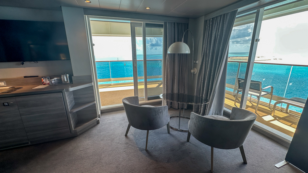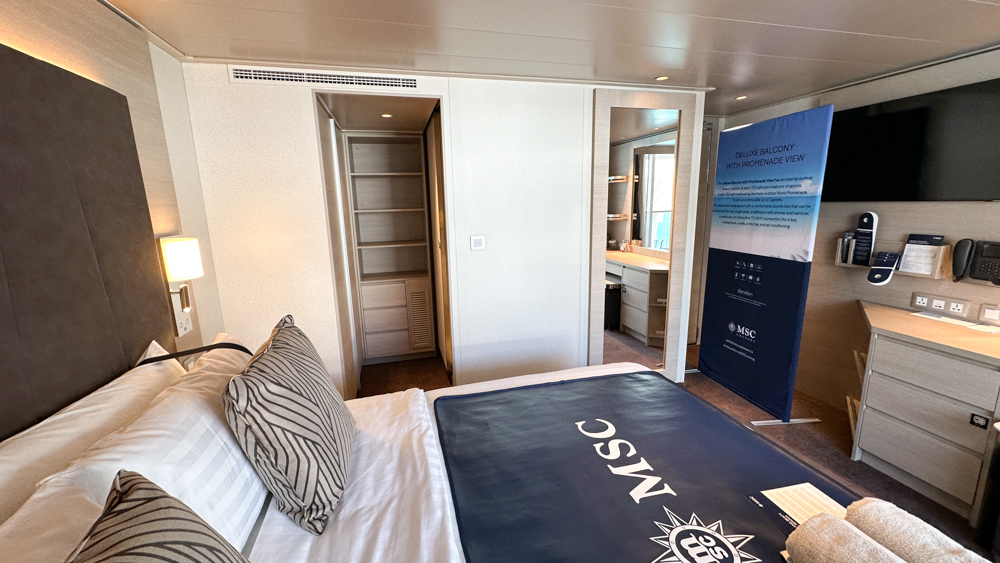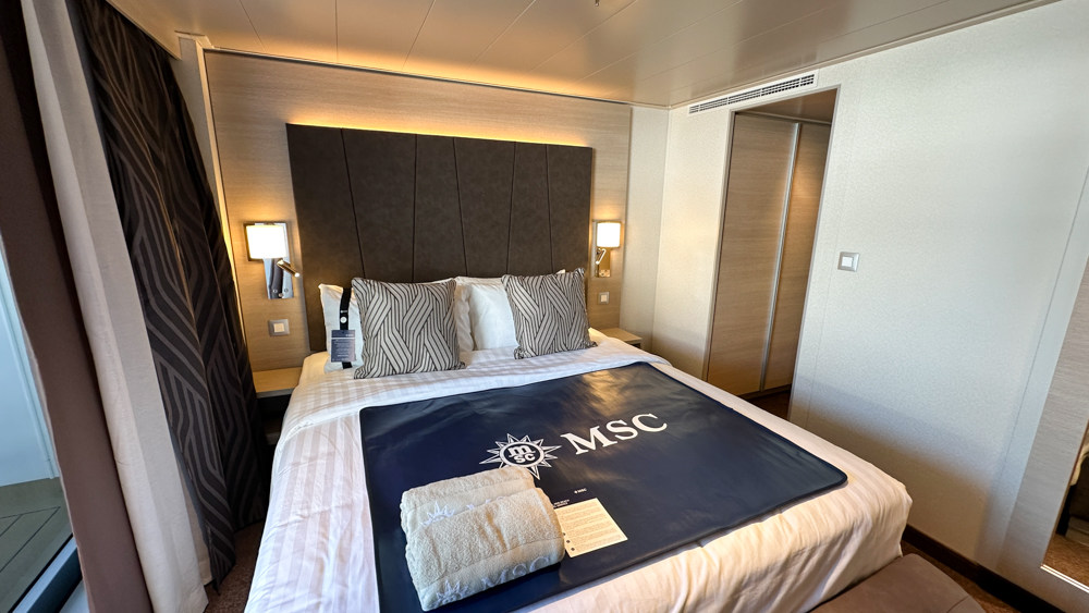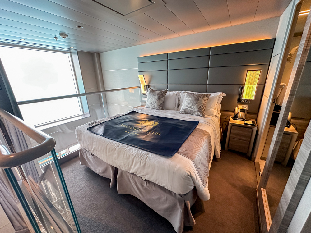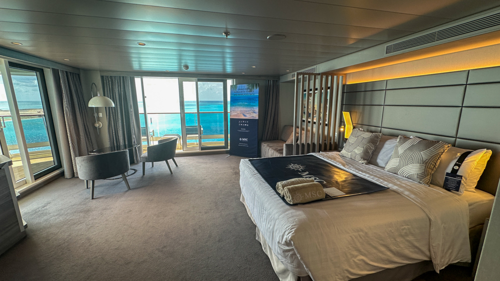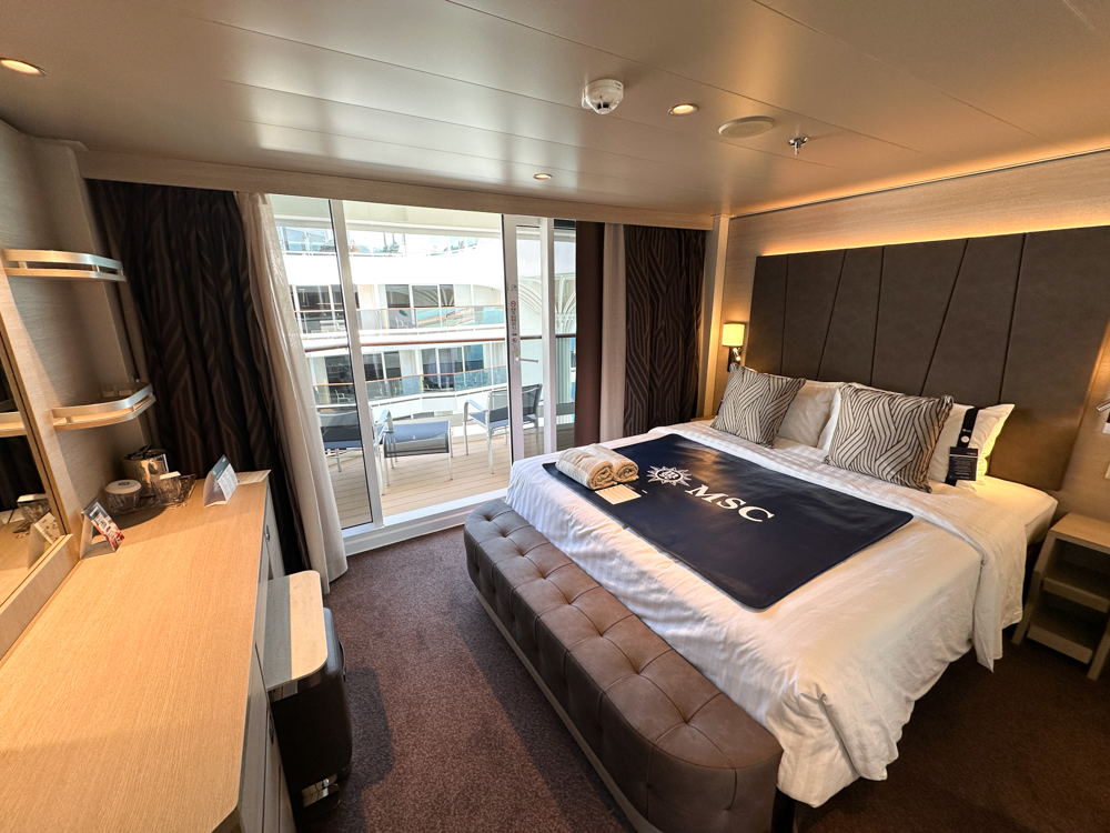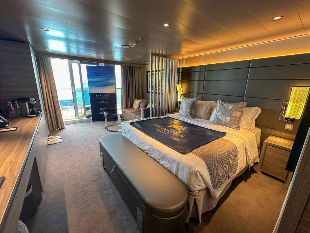 Ik bekeek een MSC Yacht Club Deluxe Suite voor je: no. 19015. De Suite komt met butlerservice en tal van extra’s zoals een nespresso machine, minibar (inclusief) en roomservice. Wij genoten eerder van een Yacht Club Suite in 2019 op een ander MSC schip en waren verrast door het zeer hoge service niveau (lees hier hoe het was)! Nieuw in deze suite is het bankje bij het voeteneind. De binnenruimte is 25 m2, het balkon 5 m2.