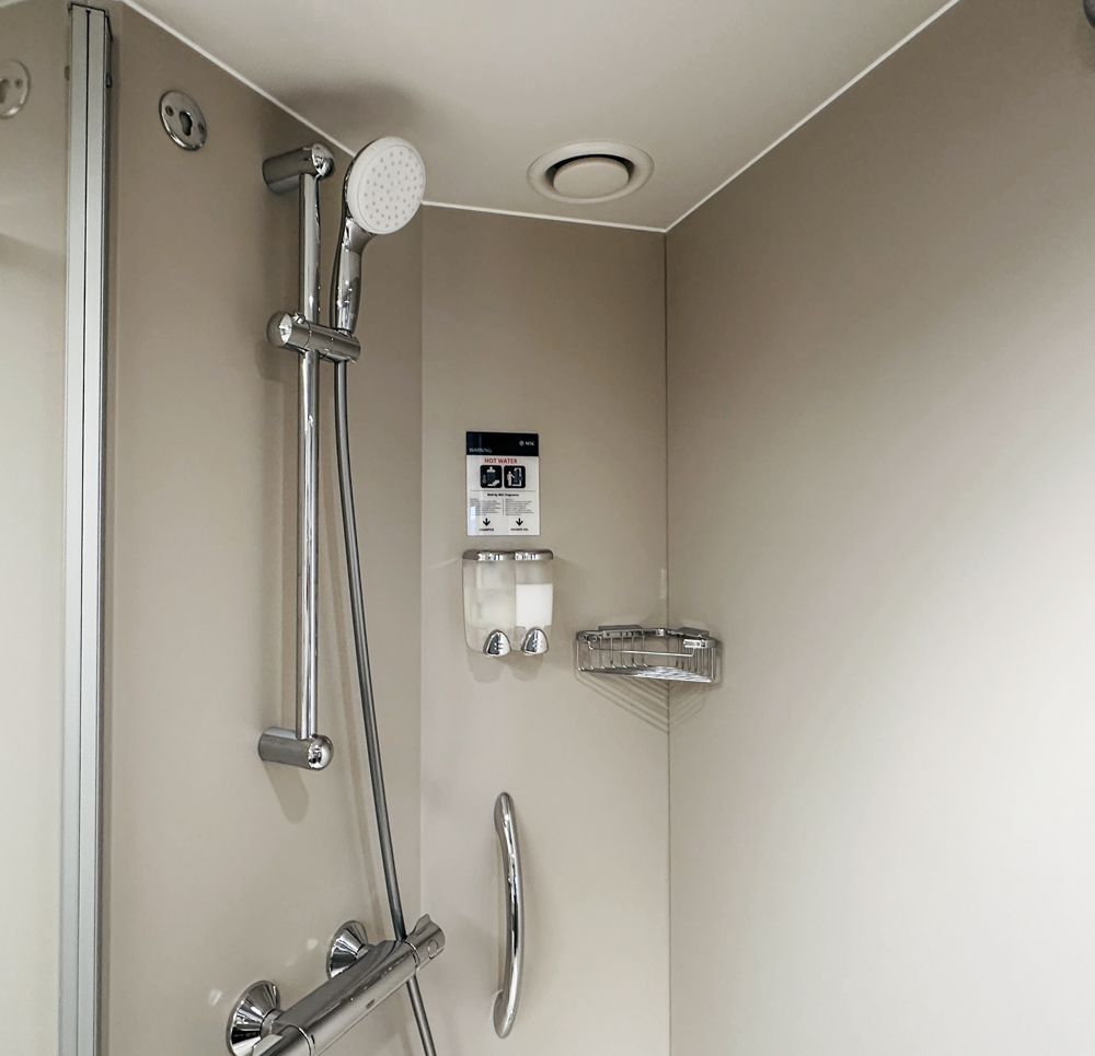 In de douchecabine hangen de douchegel en shampoo in flacons voor je klaar. De douchekop kent twee standen en onder vind je een voetenrekje. Geheel aan de bovenkant heb je de mogelijkheid een waslijntje te spannen.