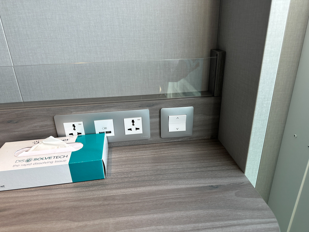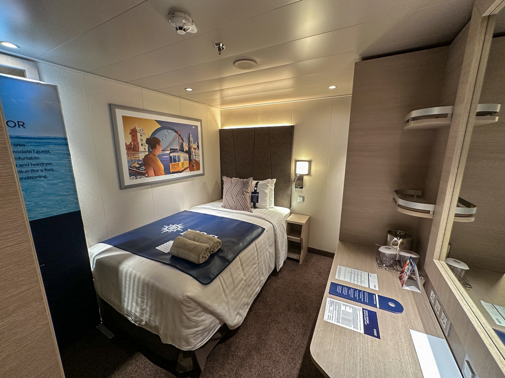 De MSC World America heeft 22 binnenhutten van 11 of 12 m2 die bestemd zijn voor 1 persoon. Het bed is een Frans bed, ofwel 1,40 breed. Je hebt in deze hut dezelfde faciliteiten als alle andere hutten, zoals minibar en reguliere badkamer. Onder de spiegel op het bureau zijn voldoende (2 Europese) aansluitingen. Een usb-c aansluiting zit ook hier bij het nachtlampje. De foto’s tonen je nr. 14001.