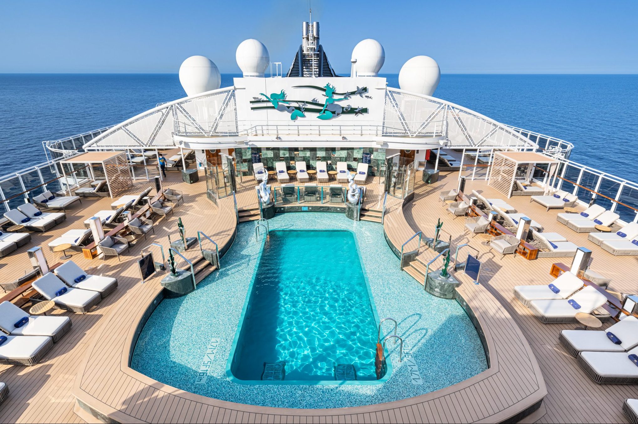Privé-zonnedek met zwembad en Grill & Bar met ligstoelen, ontspannen buiten eetgedeeltes, een zwembad en whirlpool, en stijlvolle cabana’s. Met een moderne Europese stijl en neutrale kleuren is deze ruimte ideaal om te ontspannen in de zon of te genieten van een rustige cocktail onder de sterren.