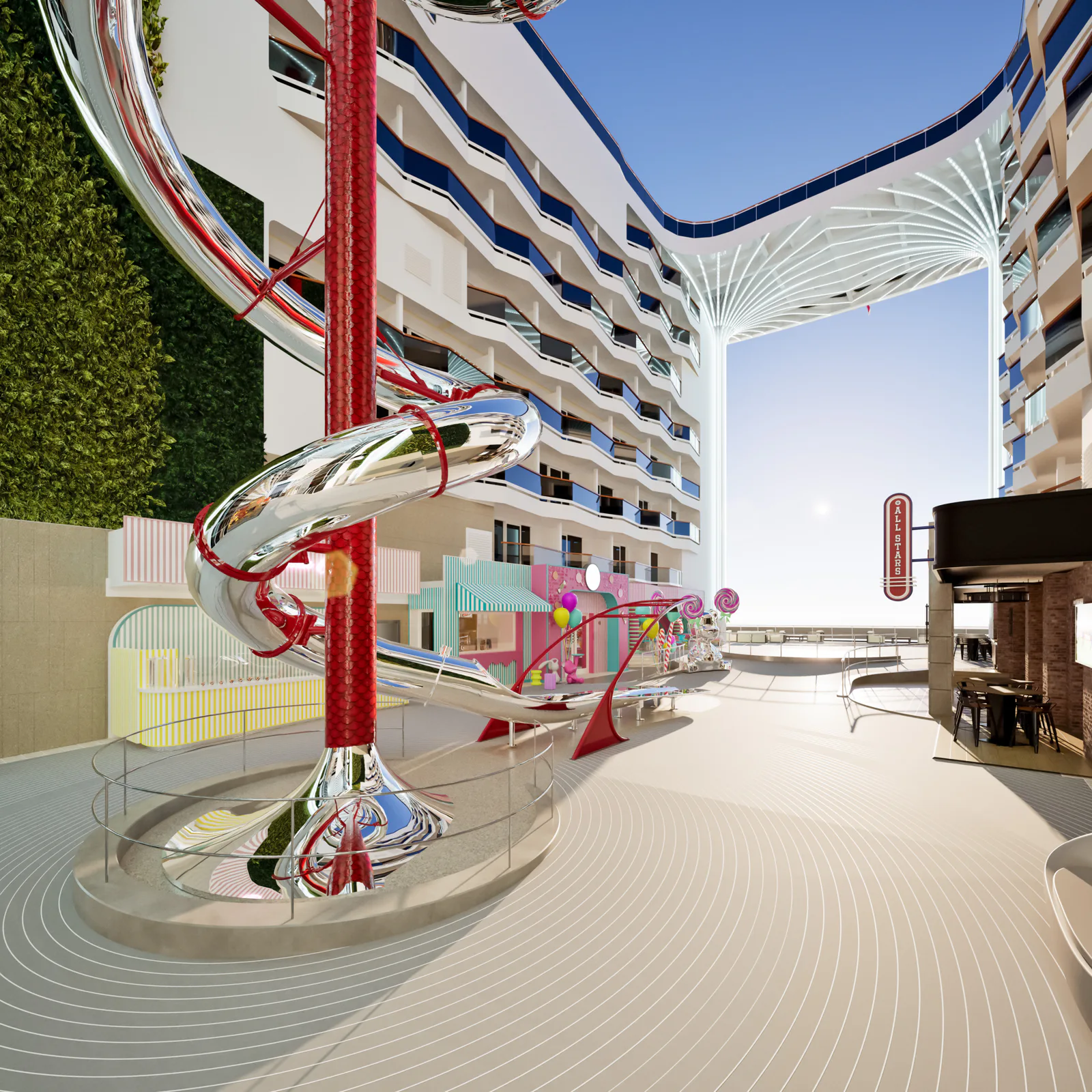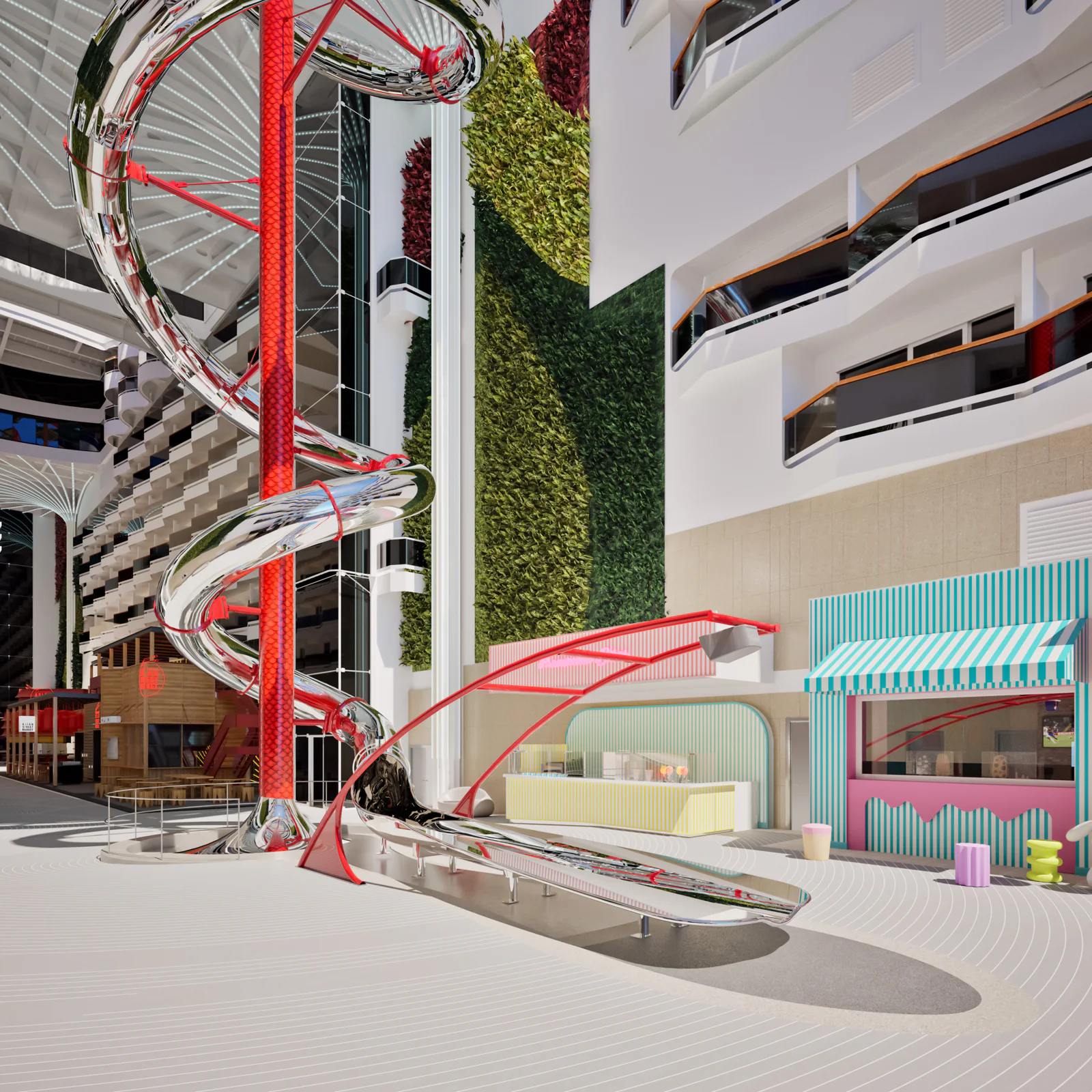 De langste droge glijbaan op zee met een lengte van 81,3 meter. Dit opvallende, kenmerkende architectonische element van MSC Cruises’ World Class-schepen biedt een spannende rit waarmee gasten in enkele seconden tussen 12 dekken kunnen glijden. Het nieuwe ontwerp wordt geïnspireerd door de bomen in de beroemde Gardens by the Bay in Singapore. Meer details volgen binnenkort.