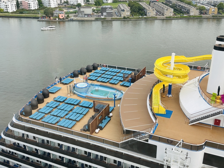 Het schip is op deze cruise voornamelijk met Amerikaanse passagiers en een kleiner aantal uit Groot-Brittannië onderweg. Amsterdam is de laatste stop van een 13-daagse cruise in de Oostzee.