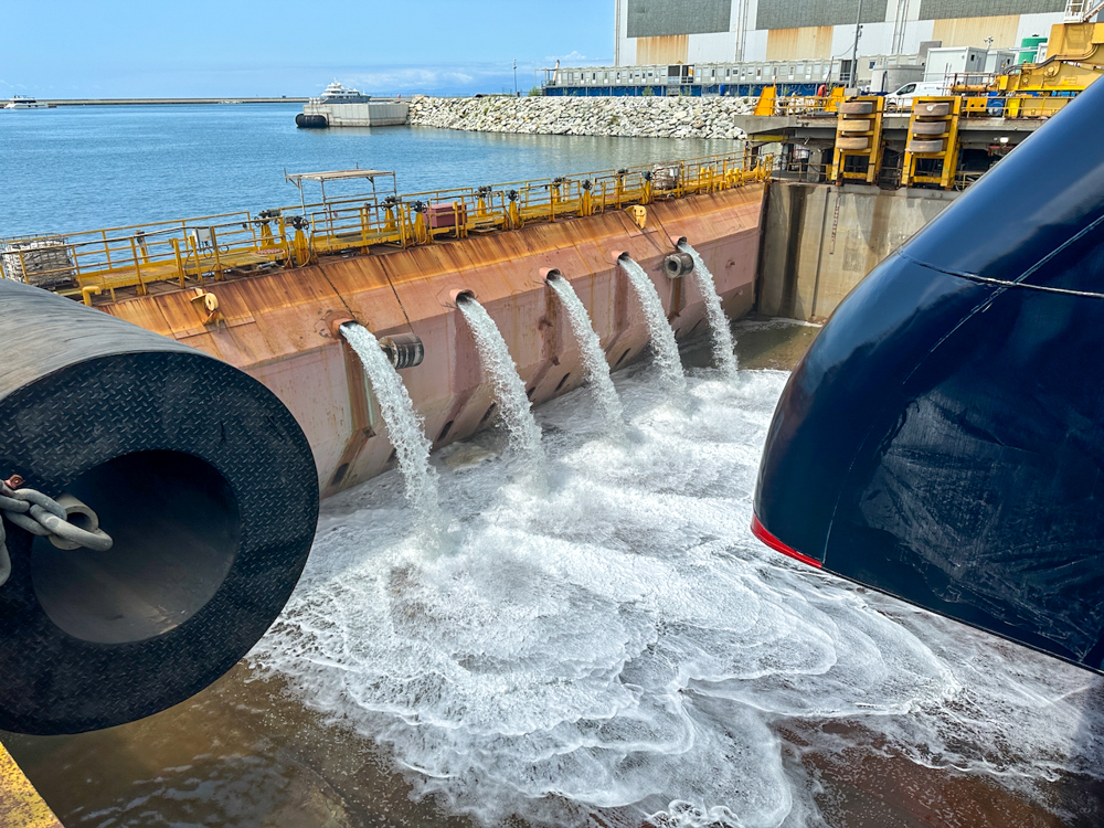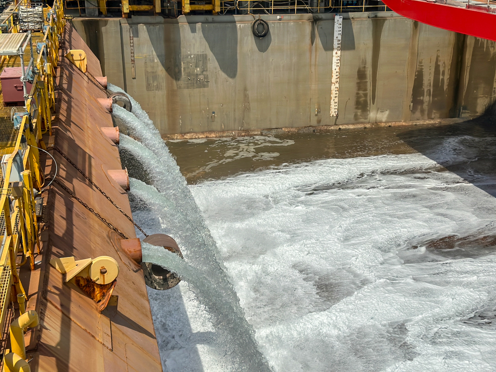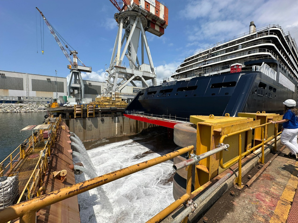 De sluizen openen zich na het gezamenlijk open draaien van een wiel, waardoor de Explora III voor de eerste keer in aanraking komt met water. Wat een prachtig moment oplevert, wanneer het water het droogdok in spuit.