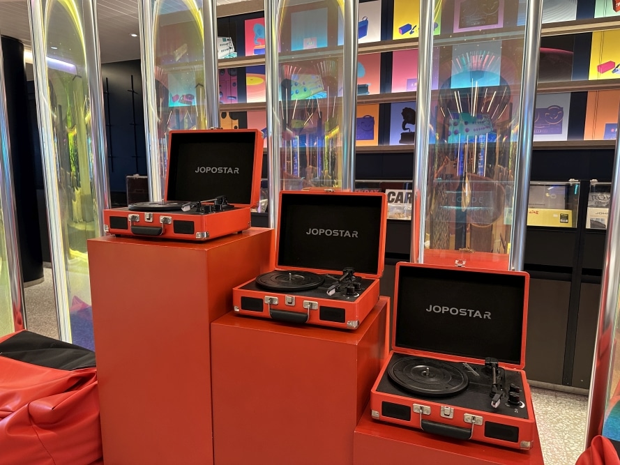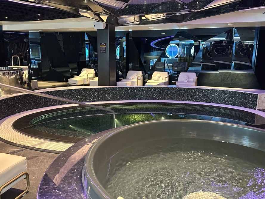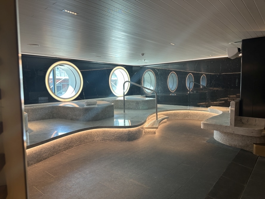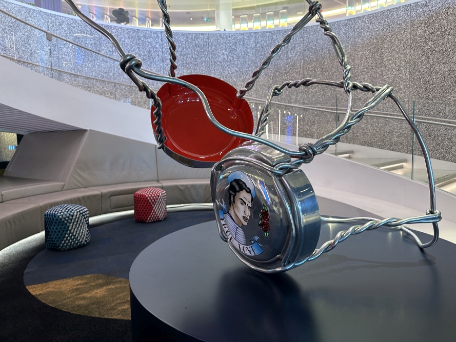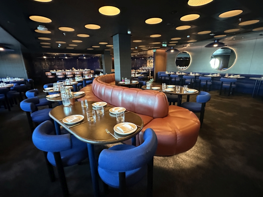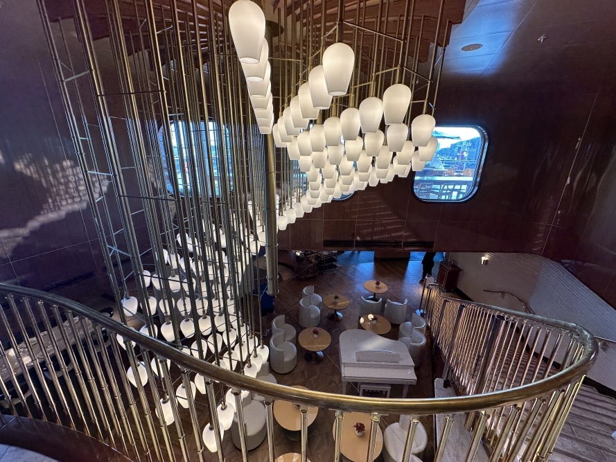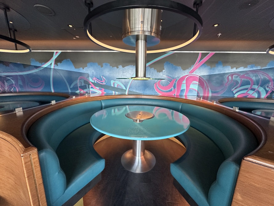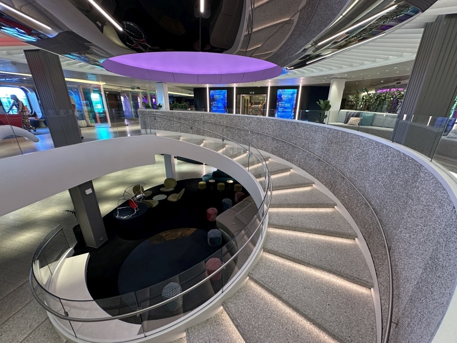 Het atrium, toepasselijk The Roundabout (= de rotonde) genoemd, is indrukwekkend ruim opgezet. De elegante, rondlopende trap die dek 6 met dek 7 verbindt, vormt meteen een blikvanger en doet denken aan gasten die ’s avonds in hun mooiste kleding de treden afdalen om de show te stelen. Een verrassend detail maakt dit atrium extra bijzonder: een DJ-booth met echte vinylplaten. Voor gasten in de exclusieve suites gaat de beleving zelfs nog een stap verder. Zij kunnen vooraf hun voorkeur doorgeven voor bepaalde langspeelplaten, die vervolgens klaar worden gelegd zodat ze in alle rust op de eigen platenspeler in de suite beluisterd kunnen worden.