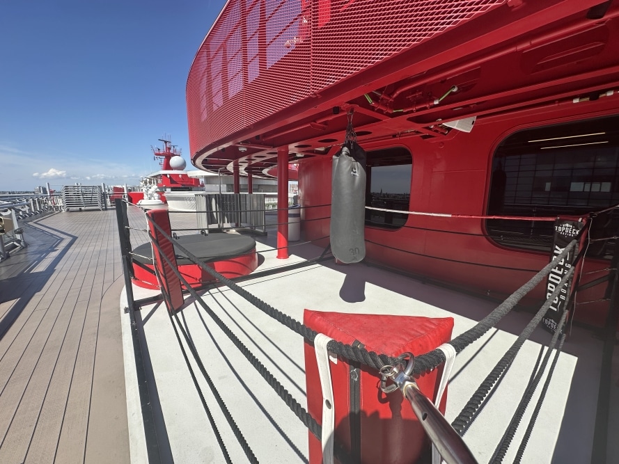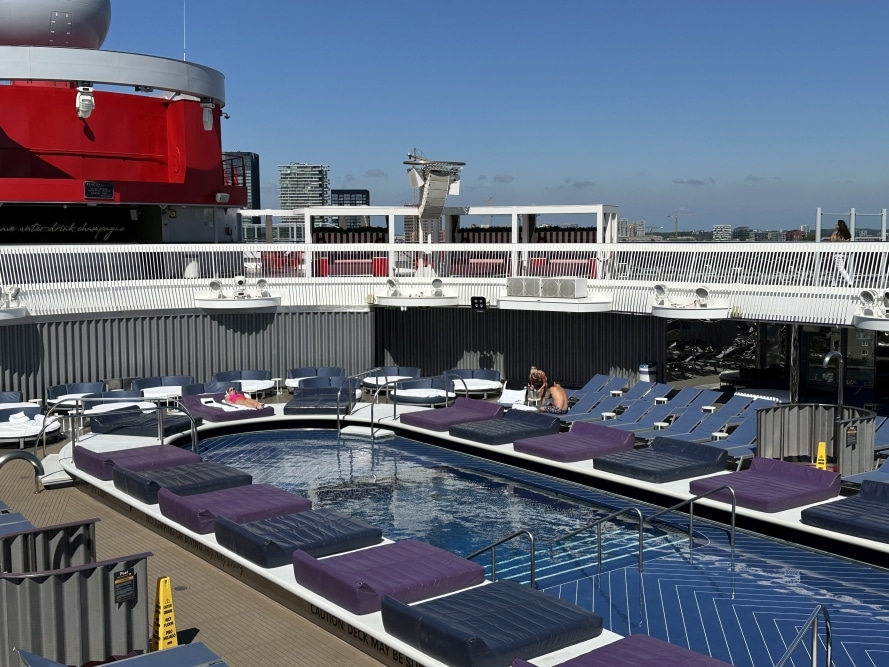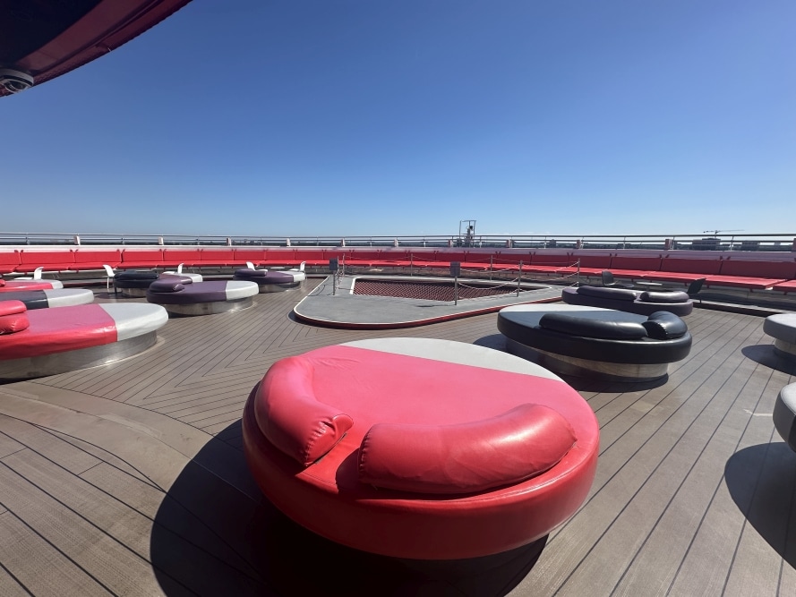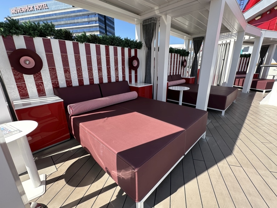 Op de buitendekken komt het iconische Virgin-rood vólop terug. Het schip beschikt over twee zwembadzones, omringd door comfortabele loungebedden waar je heerlijk kunt ontspannen. Wie net dat beetje extra luxe wil, kan tegen een toeslag een cabana reserveren. Helemaal achter op dek 16 wacht een sfeervol loungedek met een echte blikvanger: rondom geplaatste loungebanken die je uitnodigen om achterover te leunen en volop te genieten van zon en zee.