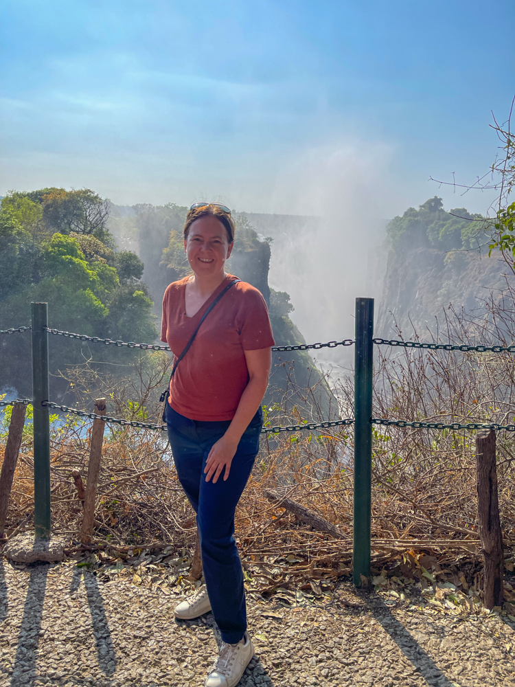 Om 7:30 is het vertrek naar de watervallen waar ik zeer benieuwd naar ben! De wandeling door het park duurt ongeveer anderhalf uur. Bij het naderen van de eerste waterval voel je al de druppeltjes water en hoor je het bulderen van het water steeds luider worden. De Victoria Falls, die bestaan uit een aantal watervallen die in een grote kloof neerkomen, zijn werkelijk adembenemend, en op sommige uitkijkpunten behoorlijk nat 😉 De Schotse ontdekkingsreiziger David Livingstone zag als eerste Europeaan (in 1855) deze watervallen en vernoemde ze naar zijn koningin, Queen Victoria.