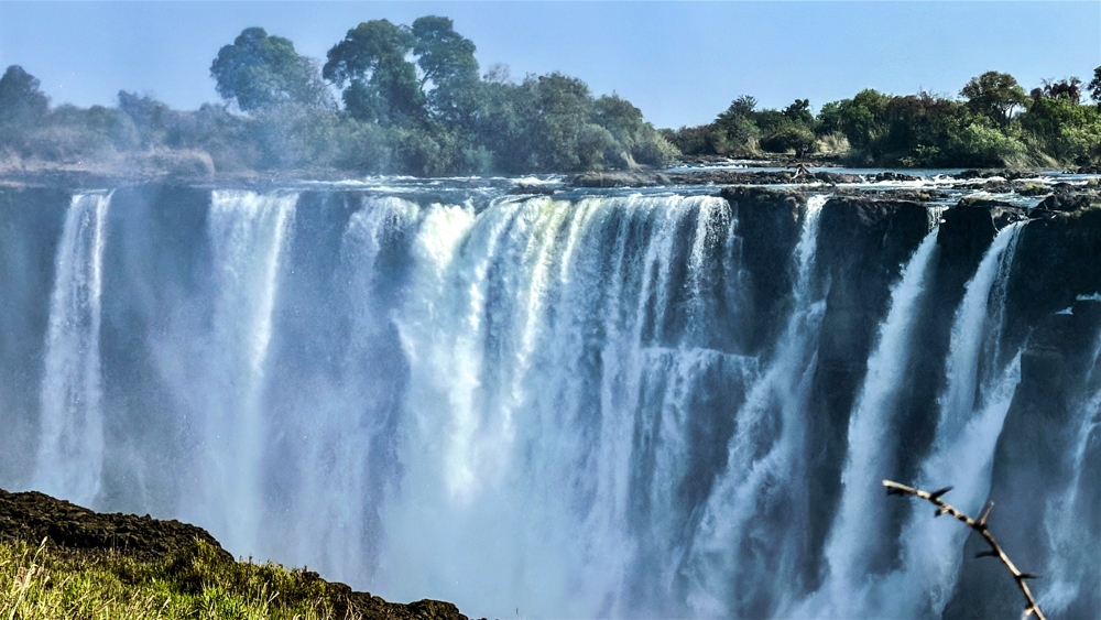Na het bezoek aan de dam van Kariba vliegen we 300 km westwaarts langs het Karibameer in een klein vliegtuig naar Victoria Falls, de Victoria watervallen. Het is een zeer toeristische bestemming, met zo’n 40.000 inwoners in de regio en een miljoen bezoekers per jaar. Na een rustige vlucht in de Cessna worden we verwelkomd door een vertegenwoordiger van CroisiAfrica en rijden we naar de Victoria Falls Safari Lodge, prachtig gelegen met uitzicht op de savanne. Lunchen doen we op een zeer bijzondere plek: op de rivier!